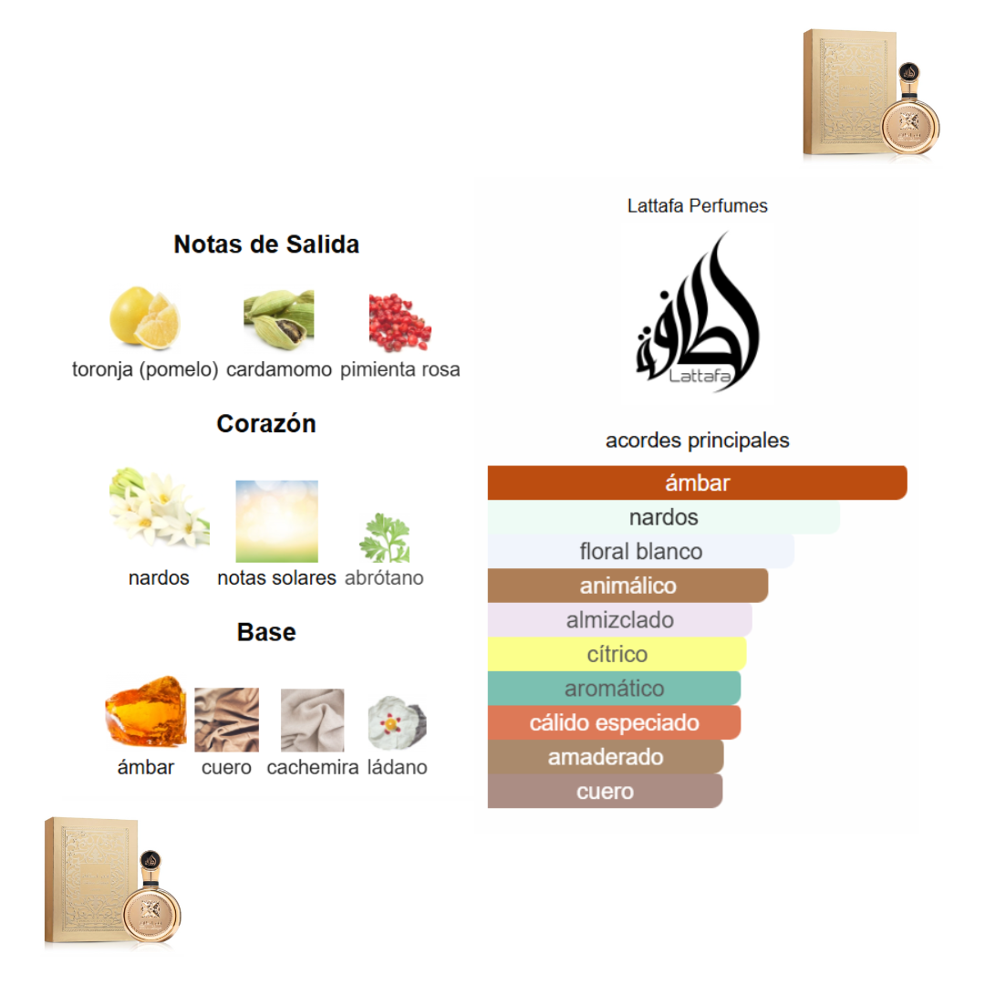 Fakhar Extrait de Lattafa Perfumes es una fragancia de la familia olfativa para Hombres. Esta fragrancia es nueva. Fakhar Extrait se lanzó en 2023. Las Notas de Salida son toronja (pomelo), cardamomo y pimienta rosa; las Notas de Corazón son nardos, notas solares y abrótano; las Notas de Fondo son ámbar, cuero, cachemira y ládano.