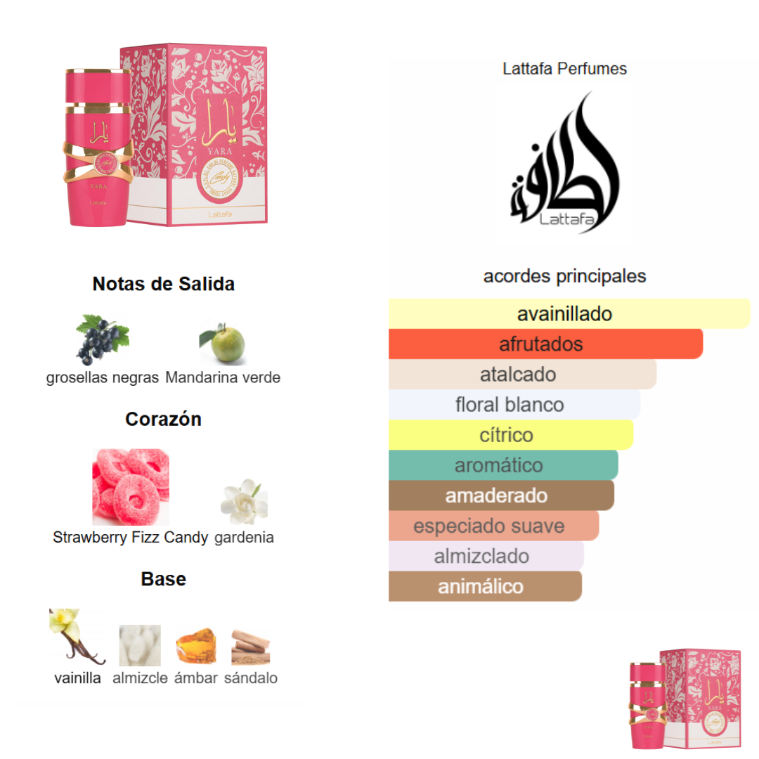 Yara Candy de Lattafa Perfumes es una fragancia de la familia olfativa Floral Frutal Gourmand para Mujeres. Esta fragrancia es nueva. Yara Candy se lanzó en 2024. Las Notas de Salida son grosellas negras y Mandarina verde; las Notas de Corazón son Strawberry Fizz Candy y gardenia; las Notas de Fondo son vainilla, almizcle, ámbar y sándalo.